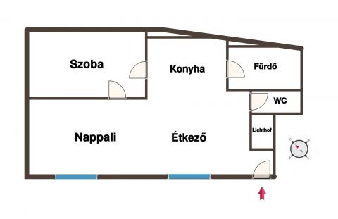 A lakás egy 140 m²-es ingatlanból lett kialakítva, három különálló lakás egyikeként (46, 68 és 26 m²). Mindhárom lakás külön bejárattal a függőfolyosóról nyílik.