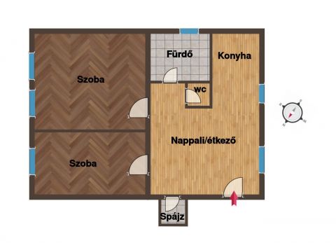 A lakásba belépve parafa burkolatú amerikai konyhás nappalit találunk, innen nyílik a két külön bejáratú jó méretű, szép parkettás szoba, a régebben felújított külön fürdő és wc, továbbá egy spájz is helyet kapott.