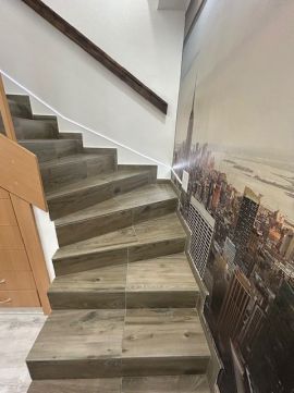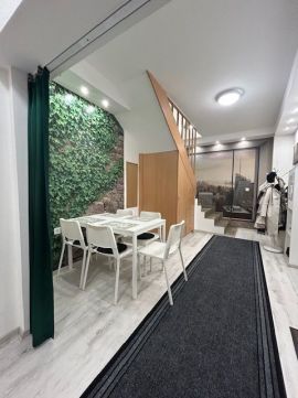The interior is practical and cozy: upon entering, you'll find a comfortable dining area and a kitchen equipped with built-in furniture and appliances. From here, you can access the upper floor. Storage cabinets under the stairs help maintain order. The staircase to the upper level is solidly tiled and leads into a hallway. From this hallway, you can access the bathroom, which features a bathtub, modern design, toilet, brand-new water heater boiler, and washing machine. Also accessible from the hallway is the main living area, where the sleeping nook is stylishly separated with curtains, and the spacious living room is situated by the window. The large glass surface offers a stunning view of the city street, providing an authentic urban experience both day and night.