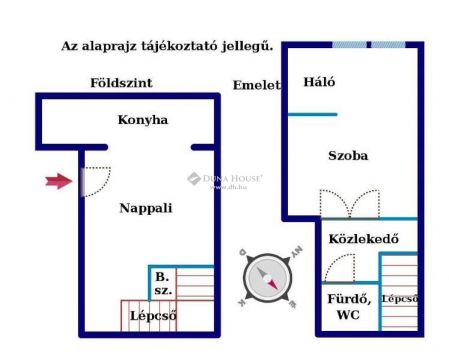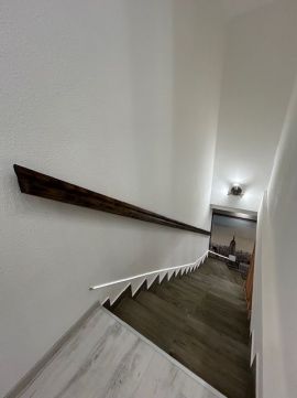 A belső tér praktikus kialakítású és hangulatos: a lakásba lépve a kényelmes étkező és a beépített bútorokkal és gépekkel felszerelt konyha fogad, valamint innen jutunk fel az emeletre. A lépcső alatti tároló szekrények segítik a rend fenntartását. Az emeletre vezető lépcső stabil járólappal borított, és egy közlekedő térbe vezet. Innen nyílik a fürdőszoba, mely kádas, modern kialakítású, WC-vel, vadonatúj vízmelegítő bojlerrel, mosógéppel felszerelt.