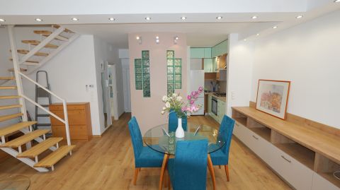 A lakás fiatalos, világos, modern teljesen bútorozott és gépesített.