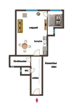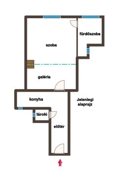 A fürdőszobából hálószoba alakítható ki, a nappaliban pedig érdemes meghagyni a galériát vendéghálónak. A konyha nappaliban való elhelyezésével a lakás bejárati részén kényelmes fürdőszoba és külön wc alakítható ki.