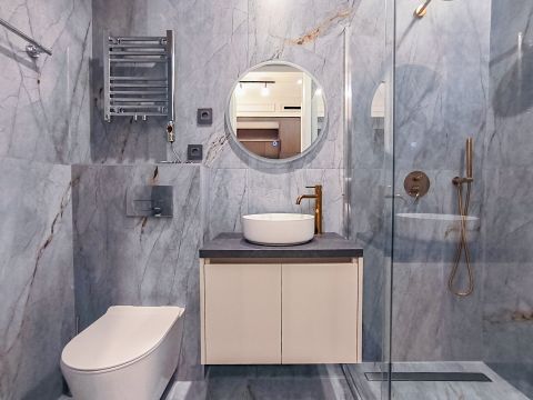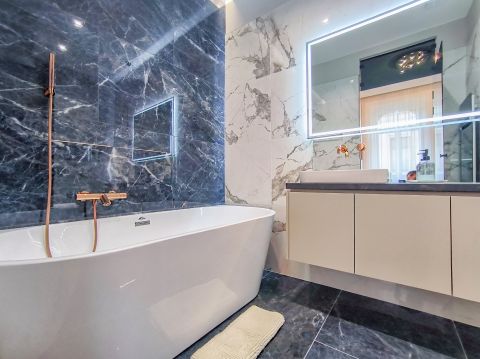 A fő hálószobához saját kádas fürdőszoba és WC tartozik, míg a második fürdő zuhanyzós kivitelű, szintén WC-vel ellátott.