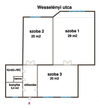 Elrendezés: 3 nagy szoba + konyha + fürdő + előszoba