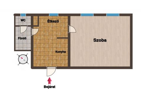 Elrendezése: szoba, konyha, étkező, fürdőszoba káddal, külön WC.