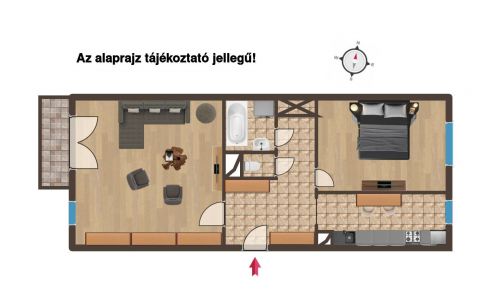 - Nappali: (21,8 m²) tágas, világos, laminált parkettával, klímával