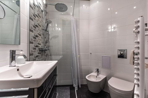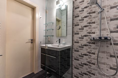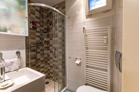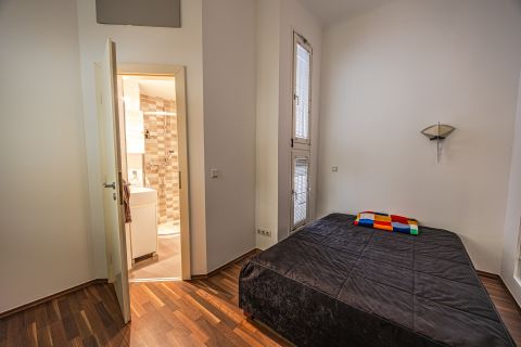 A hálószoba több irányba ablakos, innen nyílik az egyik fürdőszoba. Mindkét fürdő ablakos és WC-vel felszerelt, a nagyobbikban bidé is helyet kapott. A konyhabútor és beépített gépek ötletesen, a közlekedőt is részben kihasználva lettek megtervezve. Az ingatlan a képen látható bútorokkal kiadó.