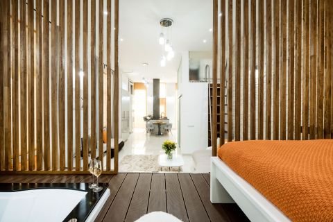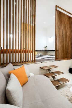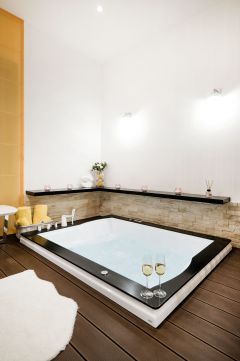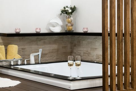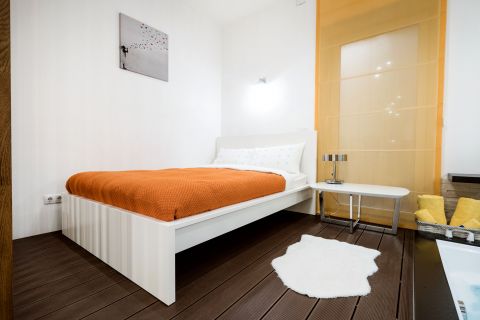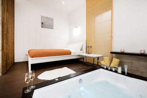 A lakás koronaékszere a hálóban elhelyezett kétszemélyes jakuzzi, amely igazi exkluzív élményt kínál az otthoni környezetben.