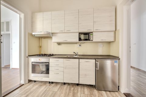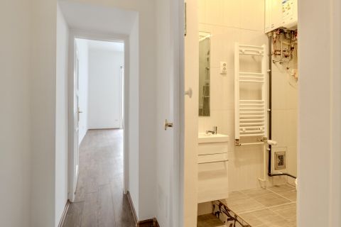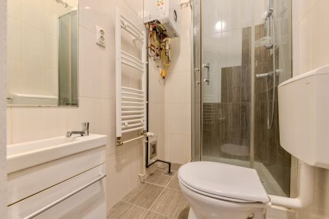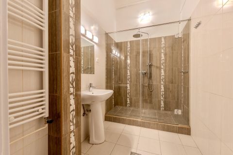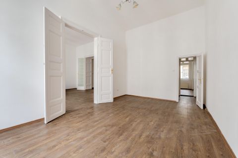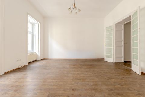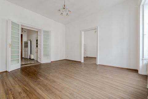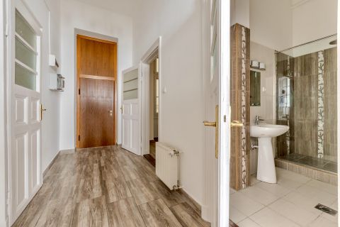 The apartment features a living room + 2 bedrooms, 2 bathrooms, and a separate WC. The layout is flexible and walkable, easily adaptable to the needs of a family. The 3.8 m high ceilings, large windows, restored historic stoves, and modern, energy-efficient condensing gas boiler give the apartment a unique classical charm.