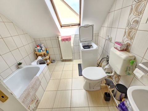 A társasházi épület szigetelt, cserépfedéses. A fűtést és a melegvizet gáz kombi kazán látja el.