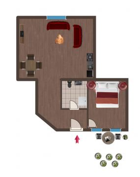 A lakás amerikai konyhás nappaliból, külön hálószobából, elegáns fürdőszobából és hosszú előtérből áll.