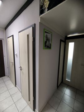 A lakás ideális elosztású. A biztonsági bejárati ajtón belépve az előszobában balra található a fürdőkádas fürdőszoba és a külön helyiségen lévő wc. Az előszoba jobb oldalának teljes hosszában vadonat új beépített szekrény található. A szekrény belső kialakítása igazán praktikus: 12 db fiók, több polc, akasztós rész és egy takarítószeres egység került kialakításra.