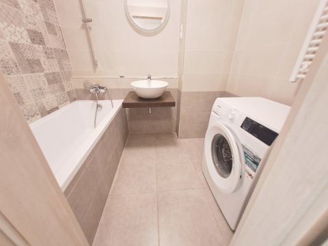 A gépesített konyhán kívül mosógép is van a lakásban.