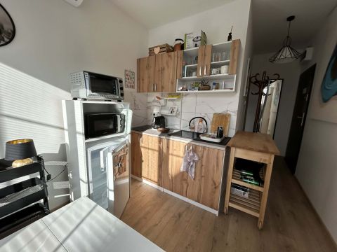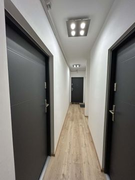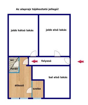 A folyosóról belépve az előszobába érkezünk, ahonnan közvetlenül nyílik a fürdőszoba. A folyosó végén található a konyha és étkező, innen pedig egy külön szoba nyílik.