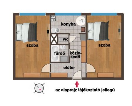 A lakás egyik legnagyobb előnye a kiváló elosztás: a két, egymástól függetlenül megközelíthető, azonos méretű szoba ideális választássá teszi lakótársak számára, bérbeadás céljára, illetve első saját otthonnak is kényelmes és jól élhető megoldást kínál.