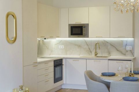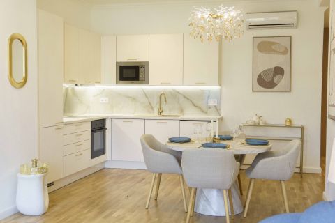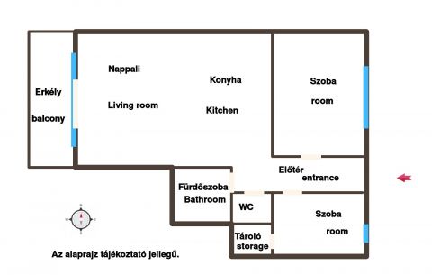 li,2 hálószoba, gépesített (mosogatógép, hűtőszekrény, sütő és főzőlap) konyha étkezővel, zuhannyal felszerelt fürdőszoba és külön WC található.