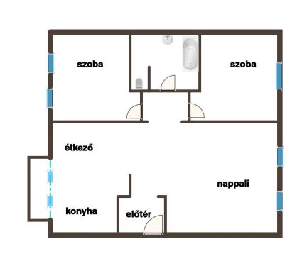 - az egyik szobában függőleges síkú bukó-nyíló fa ablak, redőnnyel