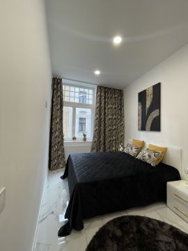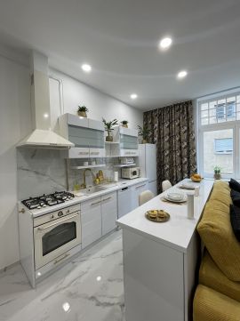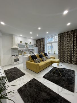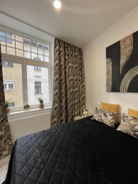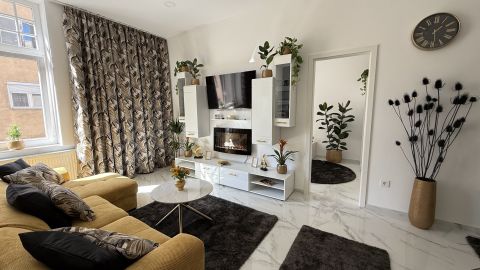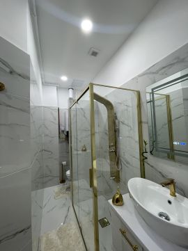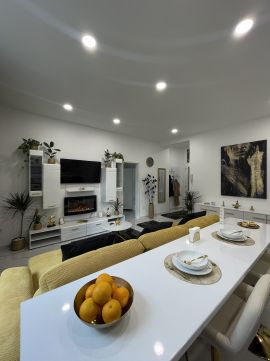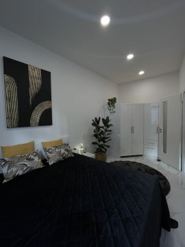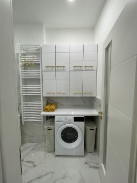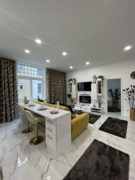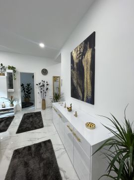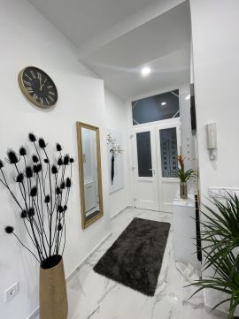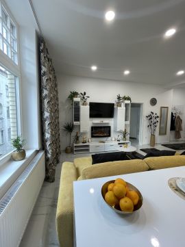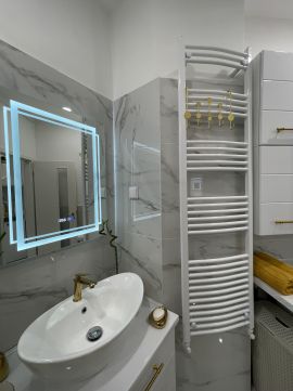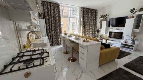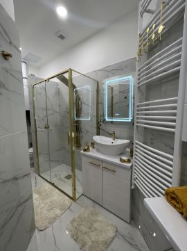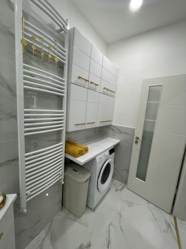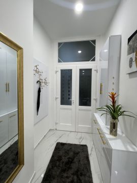 A lakás minden részletében minőségi anyagokkal és ízléses, modern stílusban került kialakításra. A világos, fehér-arany színvilág, a rejtett világítás és a letisztult bútorzat elegáns, mégis barátságos hangulatot biztosít.
