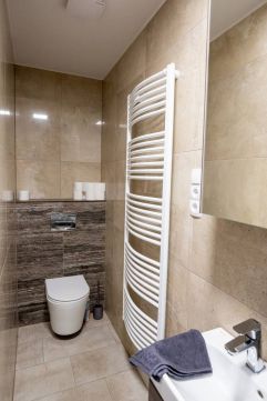 A fűtésről gáz CIRKÓ kazán gondoskodik radiátorokkal, a hűtés egy nagy teljesítményű GREE klímával megoldott.
