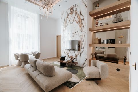 Budapest szívében, a Parlament szomszédságában művészien felújított polgári lakás, ahol a luxus és a történelem találkozik