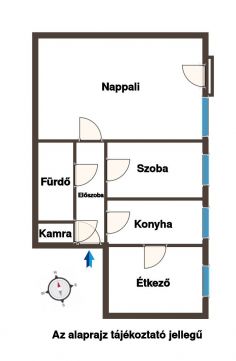Az 52 nm-es, praktikus alaprajzú, otthon áll egy francia erkélyes nappali, egy szoba, konyha, étkező, wc-s fürdő, kamra és előszoba helyiségekből, valamint egy saját pincei tároló is tartozik hozzá.