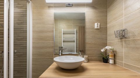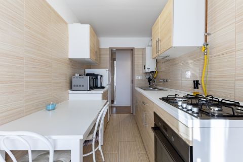 Az étkezős konyha jól elkülönül a szobától, mérete lehetővé teszi az asztalos elrendezést is. A külön háztartási helyiség praktikus tárolási lehetőséget ad, így a lakótér rendezett marad. A fürdőszoba modern, zuhanyzós kialakítású.