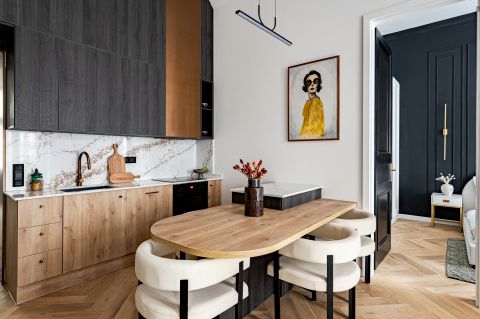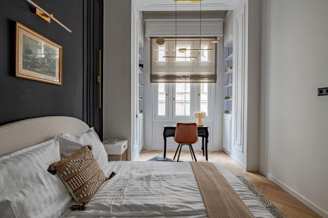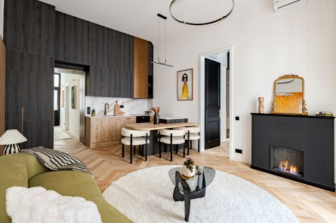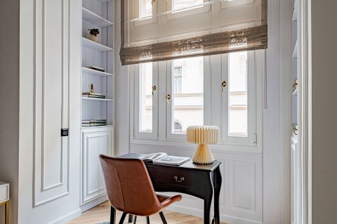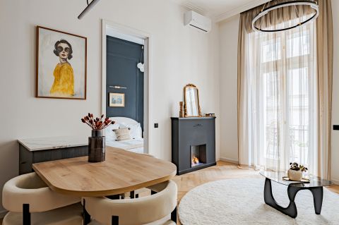 The 68 sqm, 2-bedroom, 2-bathroom property is located on the 2nd floor with bright windows overlooking the street and a balcony with partial views of the Danube riverside. The apartment features premium oak parquet flooring, custom built-in furniture, a fully equipped Bosch kitchen and a bio ethanol fireplace, with air conditioning and electric shutters in every room. In addition, the apartment has insulated wooden windows, new insert doors and modern combi central heating.