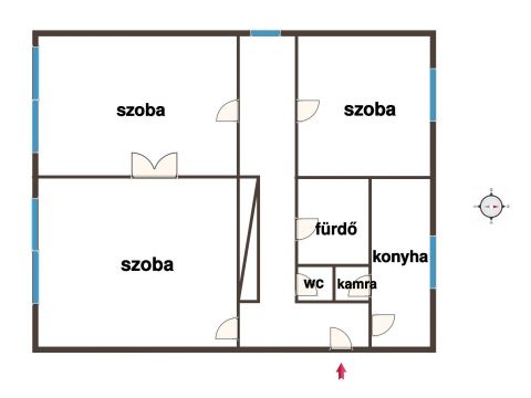 Az ingatlanba belépve egy beépített szekrényes folyosót találunk. Innen nyílik 3 kényelmes méretű szoba, valamint egy fürdő és egy wc. A közlekedő másik végén találjuk a konyhát étkezővel és a kamrát.