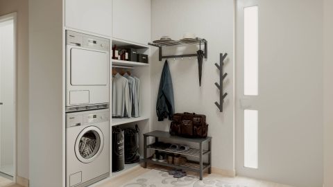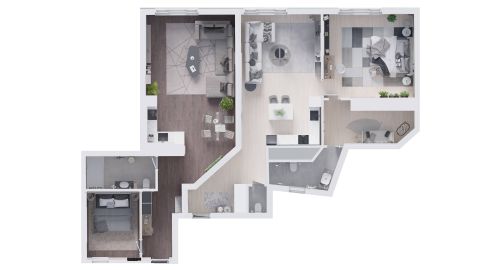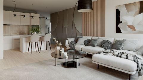 'B' lakás 56 nm és a lakás végleges kialakítása után egy amerikai konyhás nappali, egy nagy hálószoba melyből átjárás egy gardrób szobán keresztűl a fürdőszobába képet kapjuk melyíekhez még tartozik egy külön, vendég wc is az előszobában.