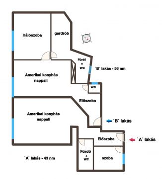 'A' lakás 43 nm és a lakás végleges kialakítása után egy amerikai konyhás nappali, egy hállószoba, ami mellett egy fürdőszoba 3 wc és egy előszoba kap helyet.