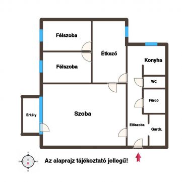 A lakás jól átgondolt elosztású: egy tágas szoba és két félszoba mellett külön étkező, konyha, fürdőszoba és WC, valamint egy praktikus gardróbhelyiség is rendelkezésre áll. A nappali klímával felszerelt, ami a melegebb hónapokban is kellemes hőmérsékletet biztosít.