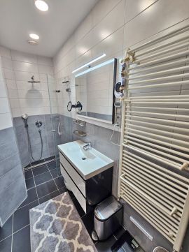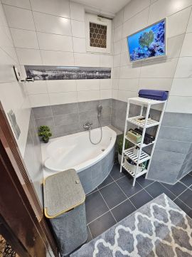-fürdőszobában sarokkád és épített zuhanyzó (padlófűtéssel és TV csatlakozás)