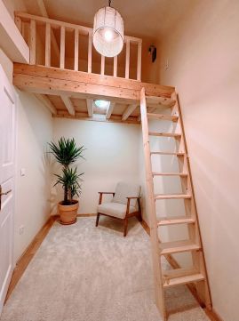 A lakás központja egy közel 35 m²-es, tágas nappali amerikai konyhával, amely ideális közös étkezésekhez, tanuláshoz vagy baráti összejövetelekhez. Innen nyílik két külön hálószoba, amelyek kompakt méretűek, viszont mindkettőben galéria növeli a hasznos teret így kényelmesen kialakítható külön alvó- és élettér.