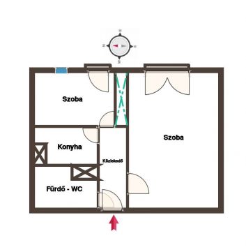 Az ingatlan belső elrendezése praktikus: egy tágas szoba, egy félszoba, közlekedő, fürdőszoba és egy főzőfülke alkotja.