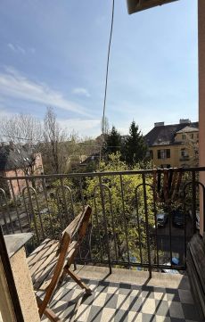 A nappali közvetlen kapcsolatban áll az erkéllyel, ahonnan zöld lombkoronákra és csendes utcára nyílik kilátás ritka nyugalom a város szívében.