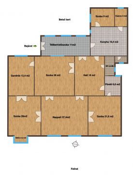A 37 m²-es nappali és a több, különnyíló szoba világos, ÉK és DNy tájolású, utcai és belső kertre néző ablakokkal.