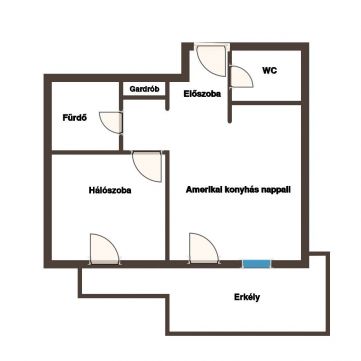 A lakás amerikai konyhás nappalival és külön hálószobával rendelkezik, a nappaliból és a hálószobából is kijárat nyílik a nagy erkélyre.