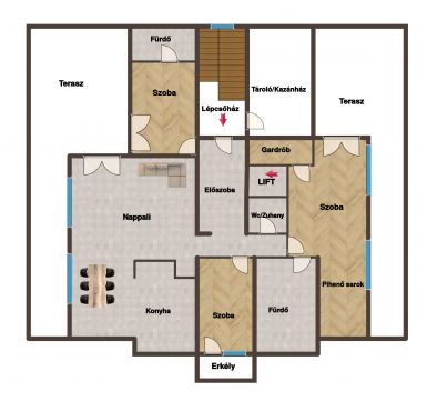 - 1 hálószoba saját fürdővel és teraszkapcsolattal