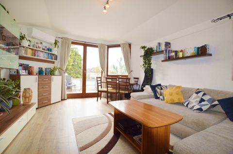 Frissített belső terek: A lakás 4 éve részleges esztétikai és műszaki felújítást kapott: új belső nyílászárók, modern konyhabútor, laminált padló és klímaberendezés gondoskodik a kényelemről.