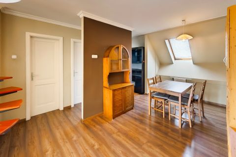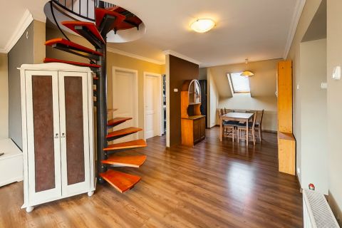 A lakás világos, barátságos hangulatú, a részben tetőtéri kialakítás egyedi karaktert kölcsönöz neki. A társasház csendes, rendezett lakóközösséggel rendelkezik.