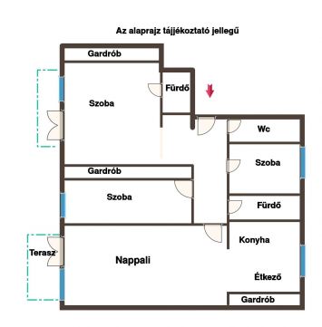 A lakás elrendezése rendkívül praktikus, az alábbi helyiségekből áll: