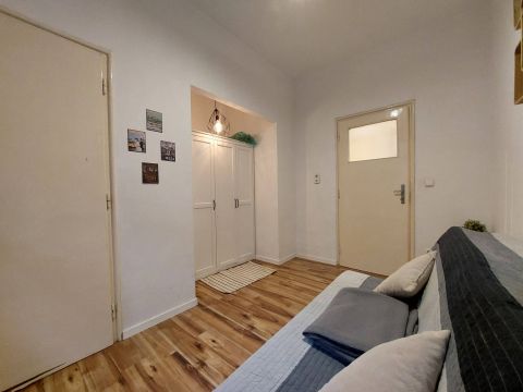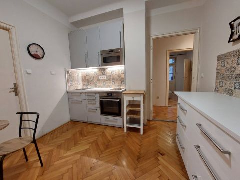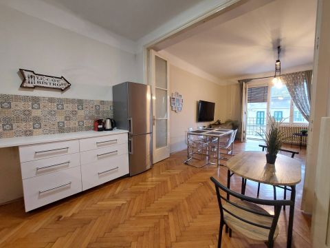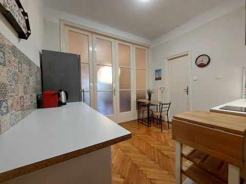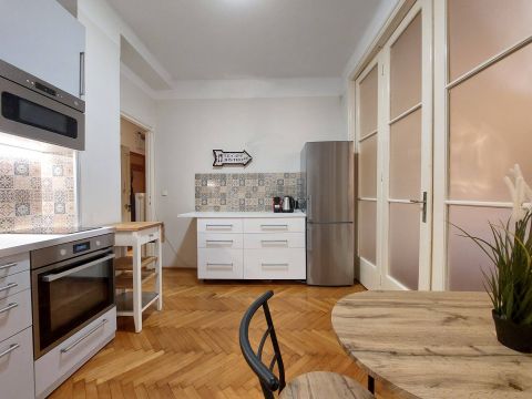 Az erkélyes nappali és a konyha egy légtérben található, de a két helyiség közötti eredeti fa harmónika ajtó igény szerint nyitható, zárható, így vendéghálóként is használható a nappali.
