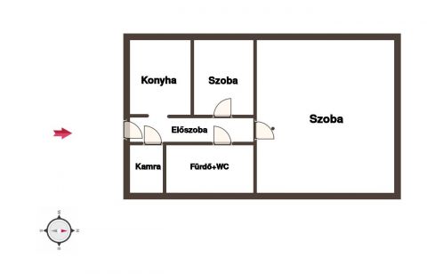 - Elrendezés: nappali + 1 hálószoba, fürdőszoba WC-vel, kamra