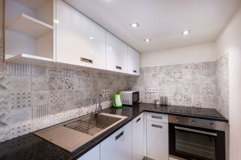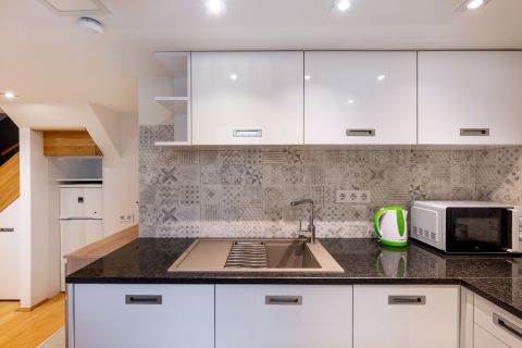 - Teljesen gépesített (mosó-szárító, mosogató, sütő, főzőlap, mikró, hűtő)