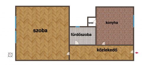 A szobában fa parketta, a többi helységben pvc, és kő burkolatok találhatóak.