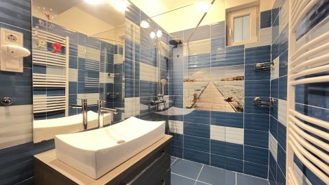 Fürdőszoba: modern, üvegfalas zuhanyzóval