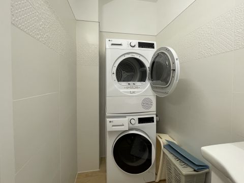 A lakás felszerelése a bútorokon kívül ,mosógép, szárítógép, elektromos tűzhely és sütő, mikró , hűtőszekrény.