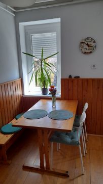 Konyha: étkezőasztal, pad + 2 szék, gáztűzhely, hűtőszekrény