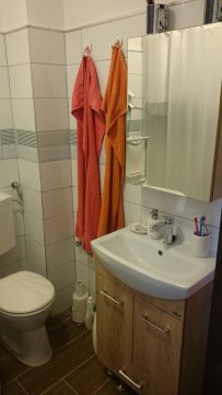 Fürdőszoba: mosógép, tükrös szekrény, fali hősugárzó