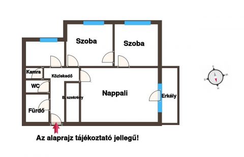 A házközponti fűtéses lakásba belépve balra a fürdő, WC, kamra, szemben a konyha és a félszoba, jobbra pedig az erkélyes tágas nappali került kialakításra, amiből nyílik a hálószoba.